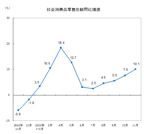 2023年11月份社會消費(fèi)品零售總額增長10.1%