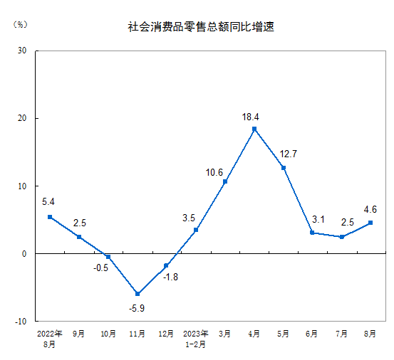 2023年8月份社會消費(fèi)品零售總額增長4.6%